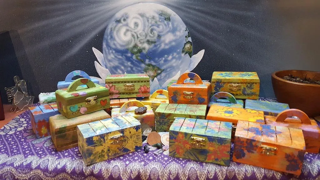 These 3" x 4" chests are tools for change and transformation of Humanity to one of more Peace and Harmony. And they are also a powerfully deep and yet easy connection to the Earth, Beloved Terra (or Gaia as some call her). One Minute of being in your Essence-Heart space with the words/feelings/thoughts of LOVE and GRATITUDE while you hold the box sends that loving energy to the EARTH. She knows you! As does God/Creator Source know and love you unconditionally.