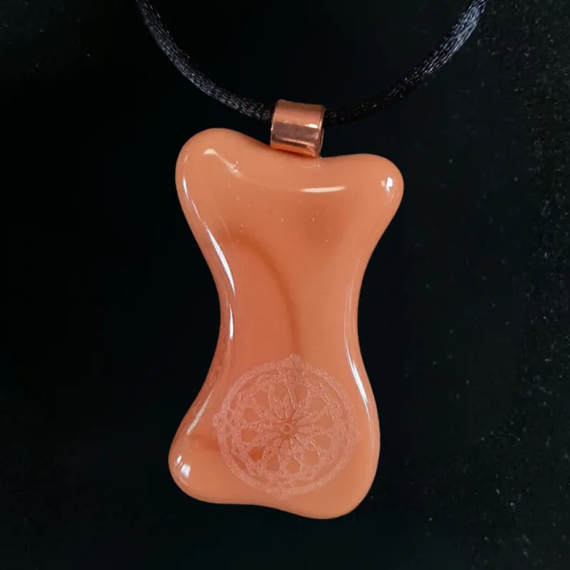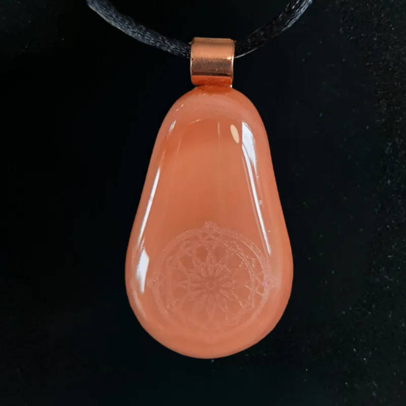 • Soft orange Fused Glass with lasered images of crop circle and logo – the shown image