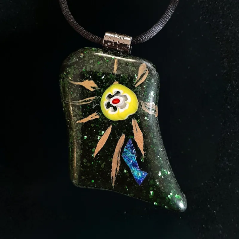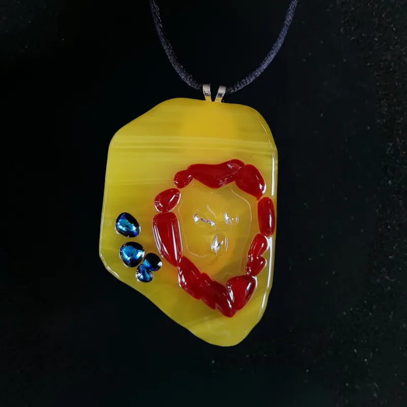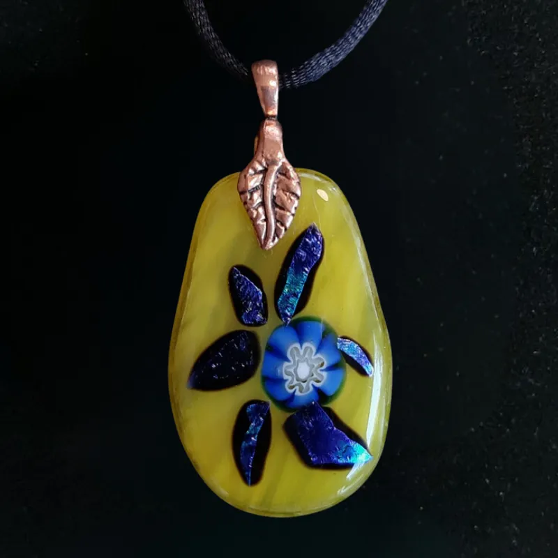 • Yellow, 1 piece with other glass (red) and dichroic and clear glass covering 3 tiny plant petals