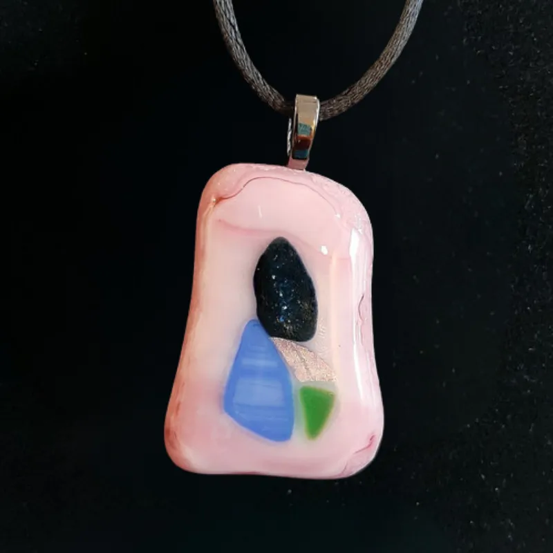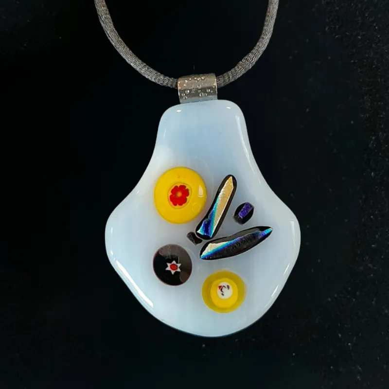 Some in the collection are made with one base piece of glass and other smaller pieces that I add are called millefiori (round) and/or dichroic glass (shiny pieces).