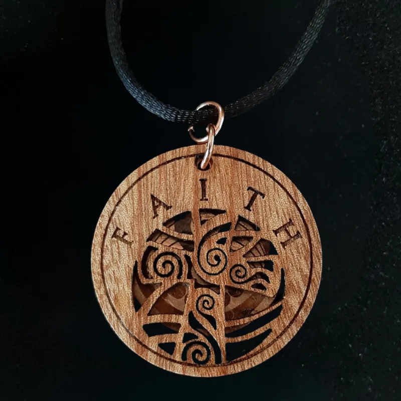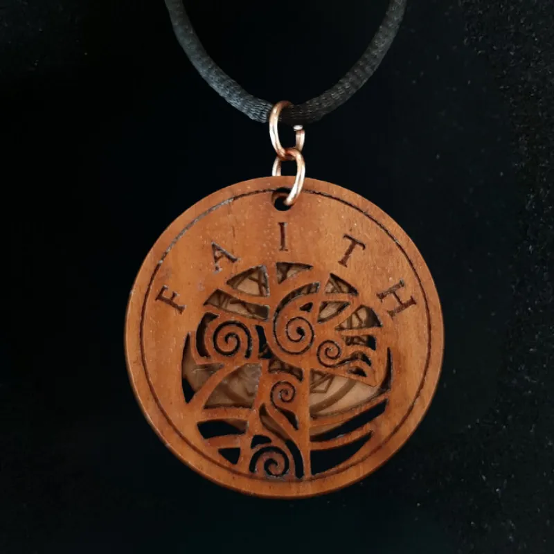 • Stained Mahogany Faith: with copper Gaian coin on the back